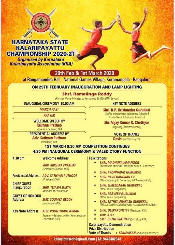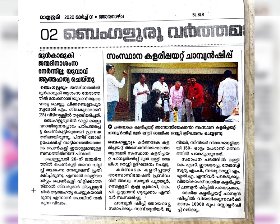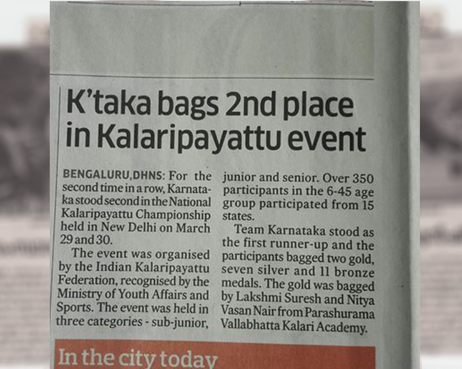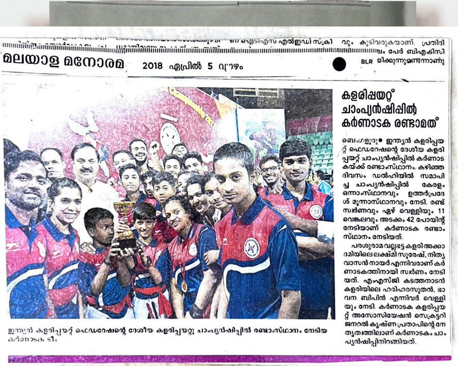 Mr. Krishnaprathap a third-generation Kalari gurukkal started his Kalari center in Bangalore in 2002. 2013 on words association with Indian Kalarippayattu Federation, he leads the practice widely in Karnataka. The Karnataka state team won the runner-up in the National Championship held by the Indian Kalarippayattu Federation since then.