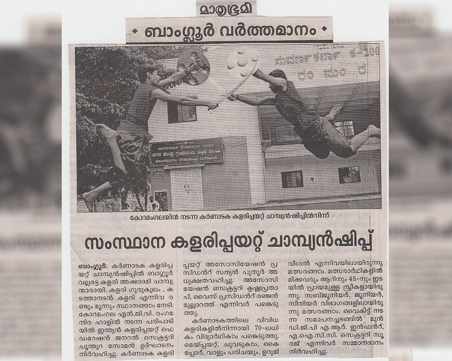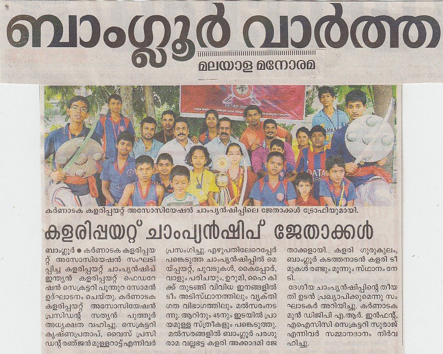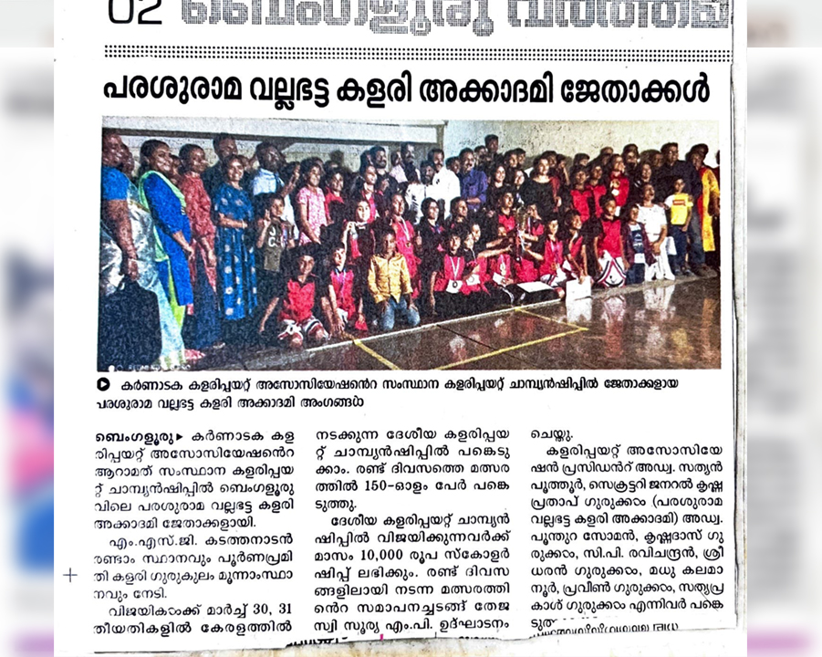 Mr. Krishnaprathap a third-generation Kalari gurukkal started his Kalari center in Bangalore in 2002. 2013 on words association with Indian Kalarippayattu Federation, he leads the practice widely in Karnataka. The Karnataka state team won the runner-up in the National Championship held by the Indian Kalarippayattu Federation since then.